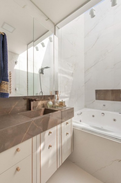 •Banheiro social: Pia com água aquecida e aquecedor de toalhas