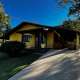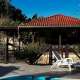 Piscina com um quiosque e salão de festas, churrasqueira, jardim completo com diversas palmeiras.